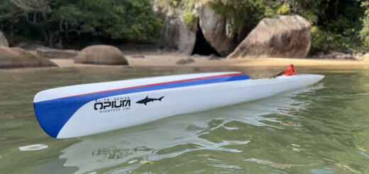Canoa de alta performance Opium Huna CO2. Fabricada inteiramente em fibra de carbono, esta canoa é leve e ideal para quem busca velocidade e eficiência na água.